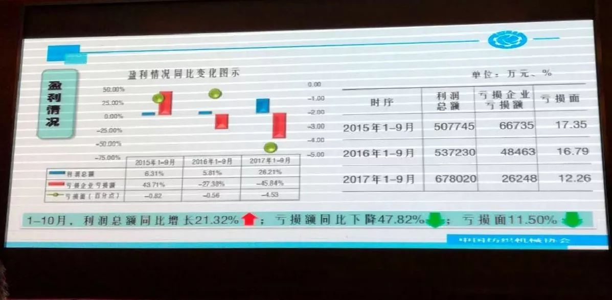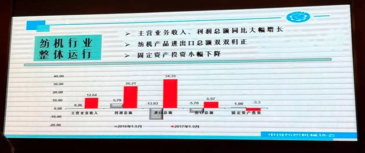 中國(guó)紡織機(jī)械協(xié)會(huì)副會(huì)長(zhǎng)顧平詳細(xì)分析了當(dāng)前紡機(jī)行業(yè)市場(chǎng)形勢(shì)和發(fā)展趨勢(shì)。今年前三季度,我國(guó)紡機(jī)行業(yè)主營(yíng)業(yè)務(wù)收入、利潤(rùn)總額等經(jīng)濟(jì)指標(biāo)同比實(shí)現(xiàn)兩位數(shù)的增長(zhǎng)。實(shí)現(xiàn)主營(yíng)業(yè)務(wù)收入948.21億元,同比增長(zhǎng)12.64%;利潤(rùn)總額67.80億元,同比增長(zhǎng)26.21%。前三季度,紡織機(jī)械出口23.92億美元,同比增長(zhǎng)6.97%;進(jìn)口25.52億美元,同比增長(zhǎng)34.35%。紡機(jī)行業(yè)固定資產(chǎn)投資額203.18億元,同比下降3.3%。顧平表示,由于國(guó)內(nèi)紡織行業(yè)運(yùn)行整體平穩(wěn)以及國(guó)際國(guó)內(nèi)紡織市場(chǎng)需求呈現(xiàn)回暖,我國(guó)紡織機(jī)械行業(yè)經(jīng)濟(jì)運(yùn)行各項(xiàng)指標(biāo)有所提升,紡機(jī)產(chǎn)品進(jìn)出口貿(mào)易額雙雙實(shí)現(xiàn)正增長(zhǎng)。紡機(jī)行業(yè)努力調(diào)整優(yōu)化產(chǎn)業(yè)結(jié)構(gòu),構(gòu)建多點(diǎn)支撐體系,跟進(jìn)“一帶一路”發(fā)展的步伐,前三季度運(yùn)行情況好于去年同期。