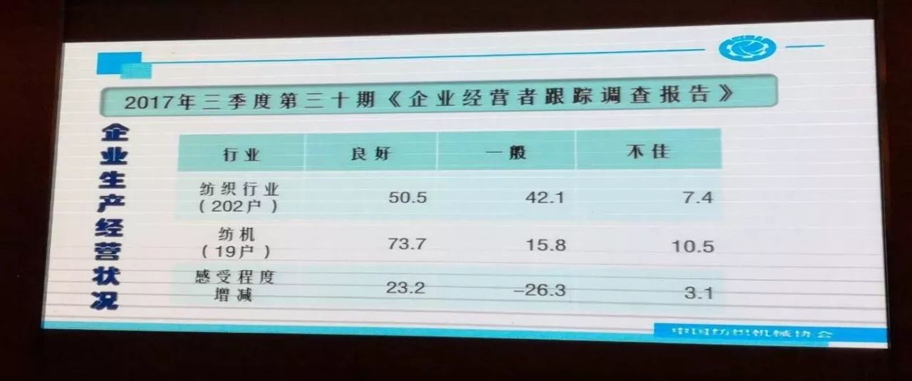 據(jù)中紡聯(lián)第三十期企業(yè)經(jīng)營(yíng)者調(diào)查問(wèn)卷的反饋,73.7%的受訪紡機(jī)企業(yè)認(rèn)為2017年三季度運(yùn)行狀況良好;56.3%的受訪企業(yè)表示三季度訂單數(shù)較上期增長(zhǎng);50%的企業(yè)表示三季度的產(chǎn)量比上期增加;73.7%的受訪企業(yè)設(shè)備利用率達(dá)到80%以上??傮w來(lái)看,企業(yè)認(rèn)為三季度紡機(jī)行業(yè)運(yùn)行情況較好,并對(duì)未來(lái)市場(chǎng)形勢(shì)表示樂(lè)觀。但生產(chǎn)成本高依然是企業(yè)經(jīng)營(yíng)面臨的重要問(wèn)題。